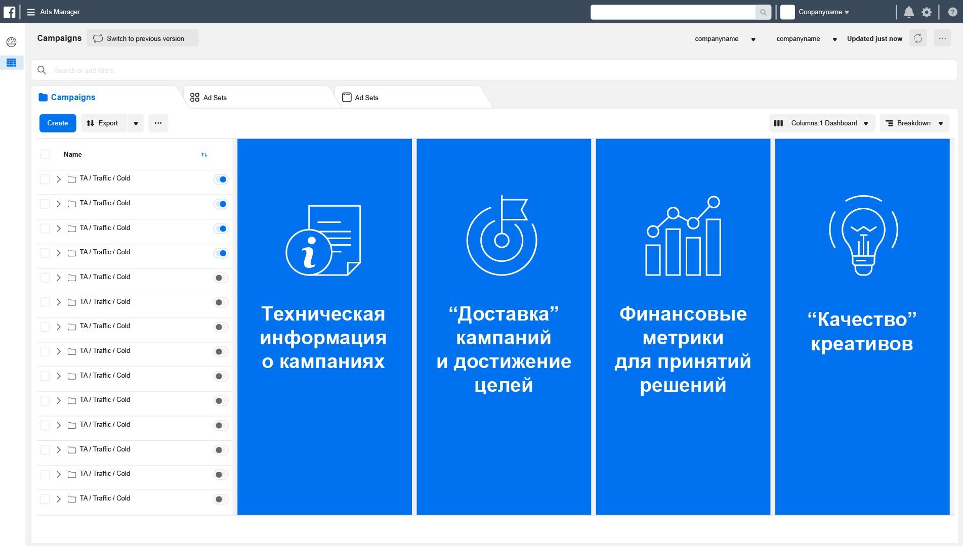 Вы создадите и настроите единый отчет, в котором удобно быстро ориентироваться и принимать решения по всем рекламным кампаниям, беря во внимания сразу множество различных метрик.