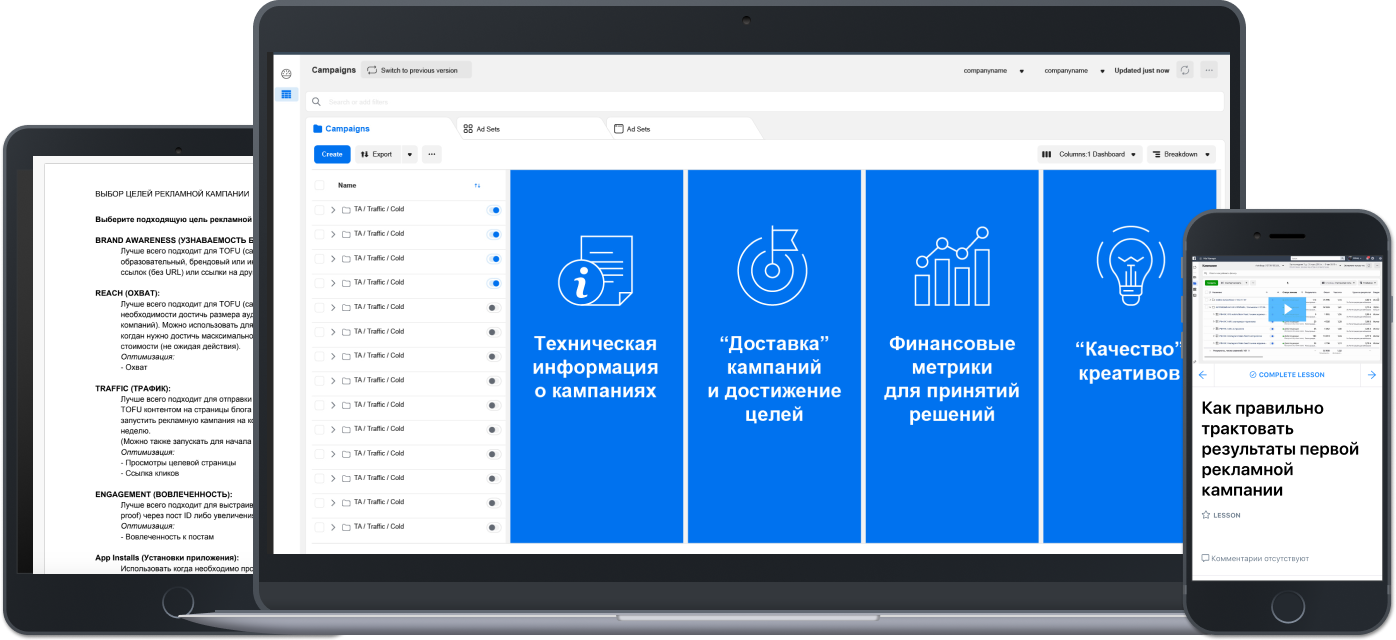- 3 видео урока с примерами чтения и трактовки данных на реальных рекламных кабинетах.